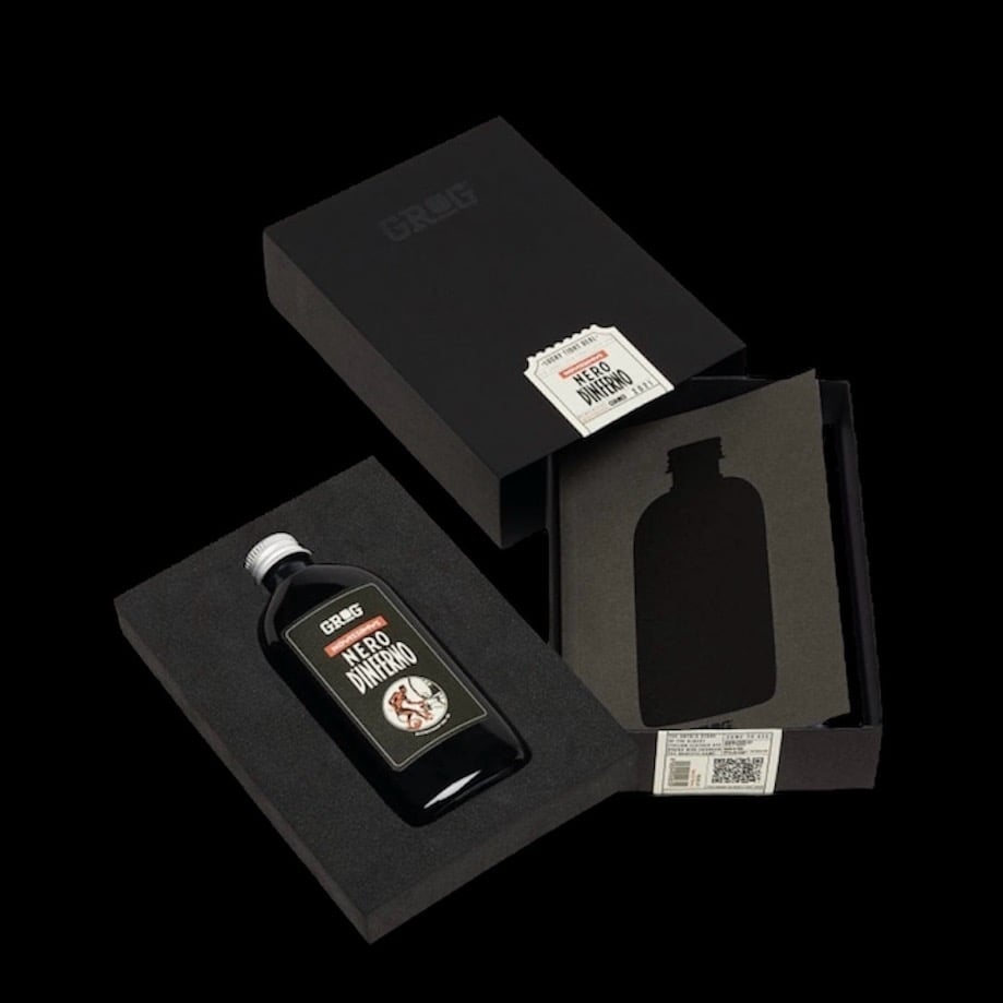 Hand-numbered luxury box celebrating a product of other times. The iconic Grog refill bottle in a precious 100 ml version meets Nero D’Inferno to mint a collector’s product, framed by a soft foam in a ton-sur-ton packaging. Inside, an A6 booklet describing an incredible story, where the needs of early ’90s writers have brought this penetrating and unalterable black dye to fame. 45 pages steeped with history, images and quotes of international writers who left their mark, literally and everywhere, over the years.